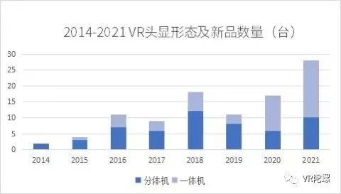 2020年开始,VR一体机发布数量陡增,**次超越分体机,至2021年,其数量几乎为分体机的一倍。具体数据如下:2020年,共发布17款VR硬件,其中分体机6款,一体机11款;2021年,共发布28款VR硬件,其中分体机10款,一体机18款。